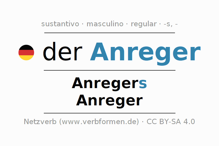 La declinación del sustantivo en forma de tabla con todas su formas: singular, plural y en los cuatro casos: nominativo (primer caso), genitivo (segundo caso), dativo (tercer caso) y acusativo (cuarto caso). Las construcciones gramaticales están representadas de forma clara en una tabla sinópica. La inflexión de los sustantivos es una ayuda durante tareas, exámenes, para cursos de alemán, la universidad, el estudio del alemán como lengua extranjera o como segundo idioma y para estudiantes adultos. La declinación correcta de las palabras es especialmente importante para los que aprenden el idioma alemán. Aquí encontraras más información acerca del tema Wiktionary Anreger y aquí también a través del Duden Anreger.