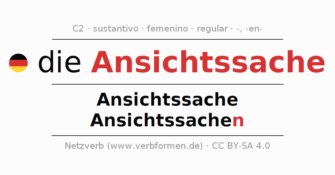 La declinación del sustantivo en forma de tabla con todas su formas: singular, plural y en los cuatro casos: nominativo (primer caso), genitivo (segundo caso), dativo (tercer caso) y acusativo (cuarto caso). Las construcciones gramaticales están representadas de forma clara en una tabla sinópica. La inflexión de los sustantivos es una ayuda durante tareas, exámenes, para cursos de alemán, la universidad, el estudio del alemán como lengua extranjera o como segundo idioma y para estudiantes adultos. La declinación correcta de las palabras es especialmente importante para los que aprenden el idioma alemán. Aquí encontraras más información acerca del tema Wiktionary Ansichtssache y aquí también a través del Duden Ansichtssache.