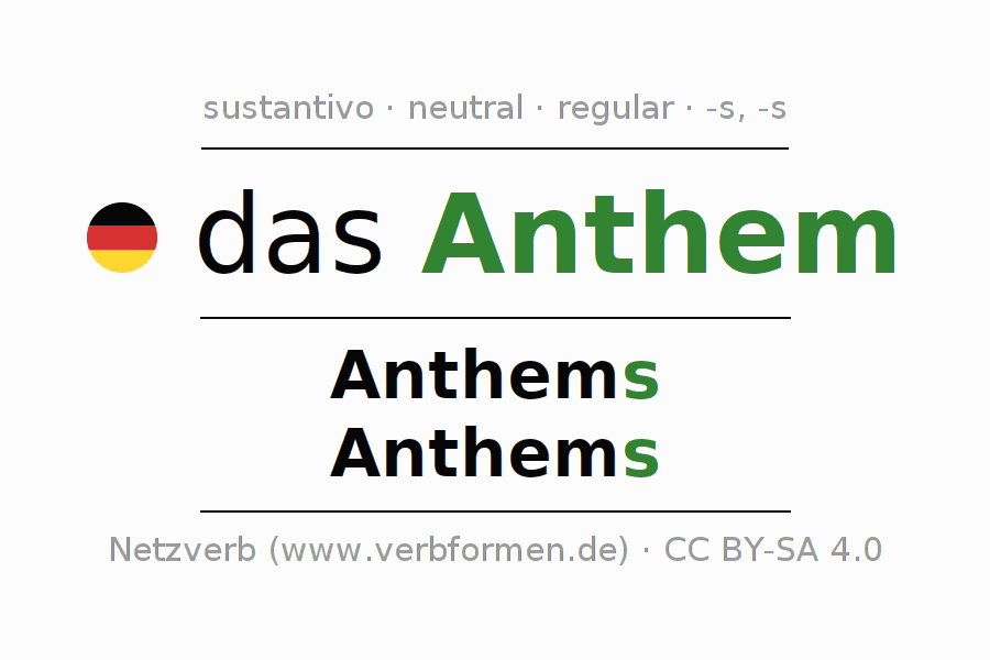 La declinación del sustantivoAnthem (himno, himno nacional) se encuentra en genitivoAnthems del singular y en el nominativoAnthems del plural. El sustantivo Anthem se conjuga de forma fuerte (irregular) con estas terminaciones s/s. El género gramatical de Anthem es neutro y por eso se requiere el artículo definido ‘das’. Aquí puedes declinar no solamente Anthem sino también todos los sustantivos alemanes . Comentarios ☆