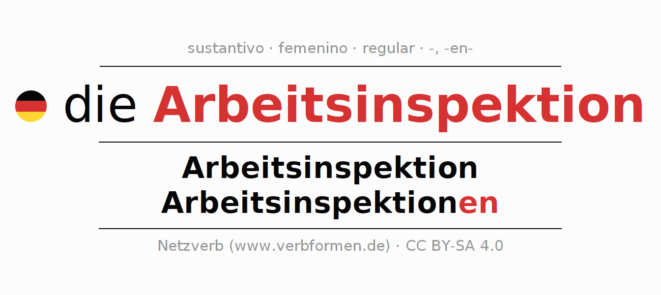 La declinación del sustantivo en forma de tabla con todas su formas: singular, plural y en los cuatro casos: nominativo (primer caso), genitivo (segundo caso), dativo (tercer caso) y acusativo (cuarto caso). Las construcciones gramaticales están representadas de forma clara en una tabla sinópica. La inflexión de los sustantivos es una ayuda durante tareas, exámenes, para cursos de alemán, la universidad, el estudio del alemán como lengua extranjera o como segundo idioma y para estudiantes adultos. La declinación correcta de las palabras es especialmente importante para los que aprenden el idioma alemán. Aquí encontraras más información acerca del tema Wiktionary Arbeitsinspektion y aquí también a través del Duden Arbeitsinspektion.