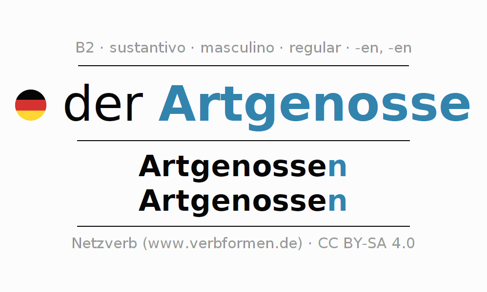 La declinación del sustantivo en forma de tabla con todas su formas: singular, plural y en los cuatro casos: nominativo (primer caso), genitivo (segundo caso), dativo (tercer caso) y acusativo (cuarto caso). Las construcciones gramaticales están representadas de forma clara en una tabla sinópica. La inflexión de los sustantivos es una ayuda durante tareas, exámenes, para cursos de alemán, la universidad, el estudio del alemán como lengua extranjera o como segundo idioma y para estudiantes adultos. La declinación correcta de las palabras es especialmente importante para los que aprenden el idioma alemán. Aquí encontraras más información acerca del tema Wiktionary Artgenosse y aquí también a través del Duden Artgenosse.
