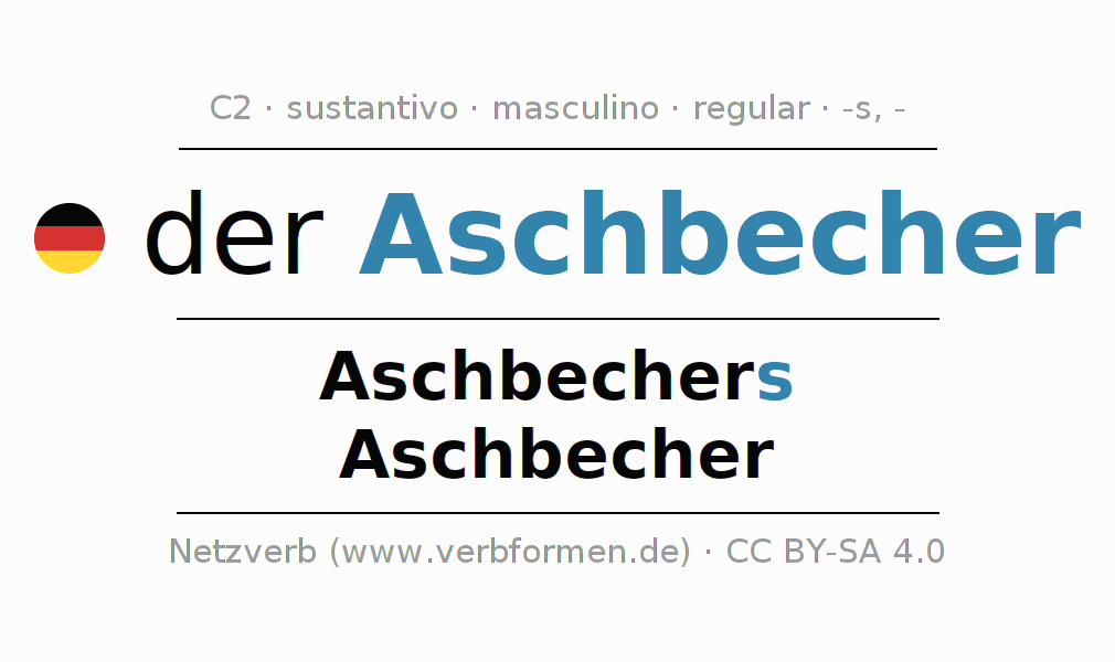 La declinación del sustantivoAschbecher (cenicero) se encuentra en genitivoAschbechers del singular y en el nominativoAschbecher del plural. El sustantivo Aschbecher se conjuga de forma fuerte (irregular) con estas terminaciones s/-. El género gramatical de Aschbecher es masculino y por eso se requiere el artículo definido ‘der’. Aquí puedes declinar no solamente Aschbecher sino también todos los sustantivos alemanes . Este sustantivo pertenece al vocabulario necesario para pasar el examen "Zertifikat Deutsch" o para el nivel C2. Comentarios ☆