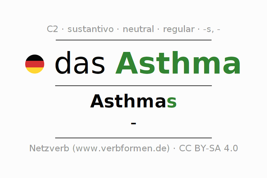 La declinación del sustantivoAsthma (asma) se encuentra en genitivoAsthmas del singular y en el nominativo- del plural. El sustantivo Asthma se conjuga de forma fuerte (irregular) con estas terminaciones s/-. No permite construcciones en plural. El género gramatical de Asthma es neutro y por eso se requiere el artículo definido ‘das’. Aquí puedes declinar no solamente Asthma sino también todos los sustantivos alemanes . Este sustantivo pertenece al vocabulario necesario para pasar el examen "Zertifikat Deutsch" o para el nivel C2. Comentarios ☆
