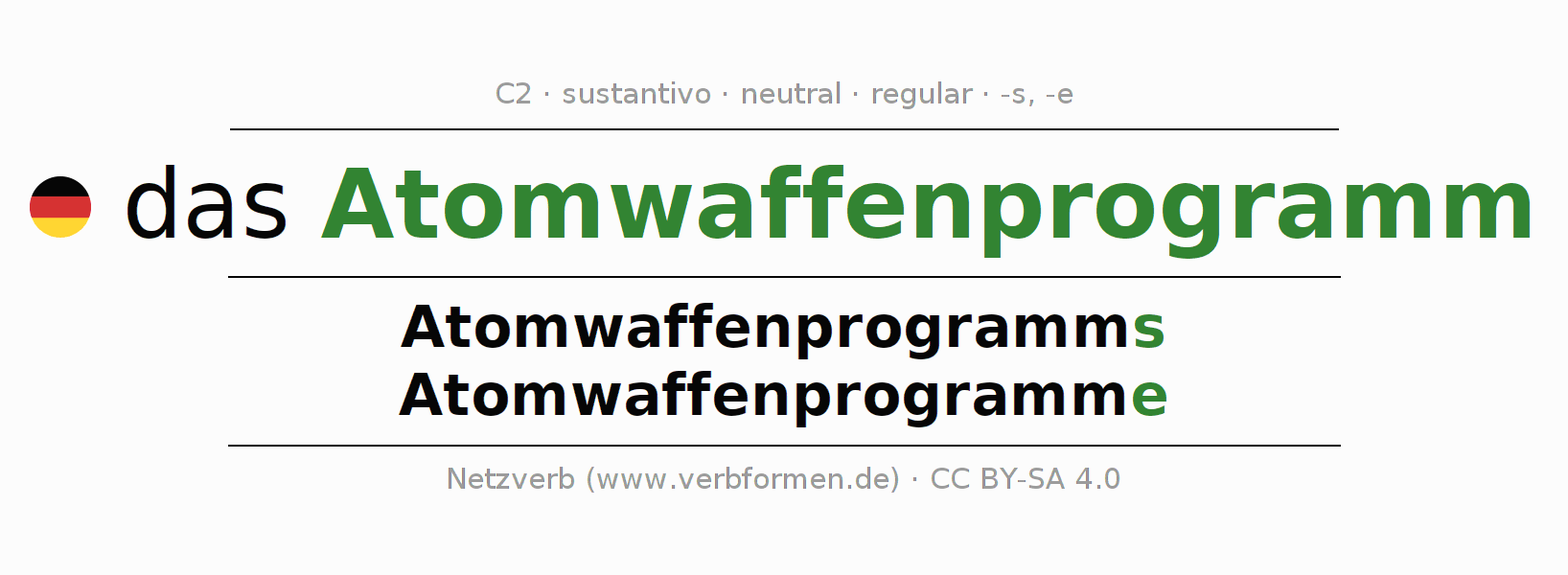 La declinación del sustantivo en forma de tabla con todas su formas: singular, plural y en los cuatro casos: nominativo (primer caso), genitivo (segundo caso), dativo (tercer caso) y acusativo (cuarto caso). Las construcciones gramaticales están representadas de forma clara en una tabla sinópica. La inflexión de los sustantivos es una ayuda durante tareas, exámenes, para cursos de alemán, la universidad, el estudio del alemán como lengua extranjera o como segundo idioma y para estudiantes adultos. La declinación correcta de las palabras es especialmente importante para los que aprenden el idioma alemán. Aquí encontraras más información acerca del tema Wiktionary Atomwaffenprogramm y aquí también a través del Duden Atomwaffenprogramm.