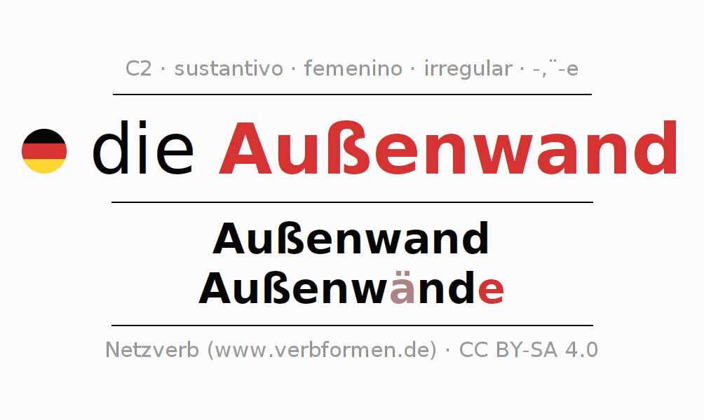 La declinación del sustantivo en forma de tabla con todas su formas: singular, plural y en los cuatro casos: nominativo (primer caso), genitivo (segundo caso), dativo (tercer caso) y acusativo (cuarto caso). Las construcciones gramaticales están representadas de forma clara en una tabla sinópica. La inflexión de los sustantivos es una ayuda durante tareas, exámenes, para cursos de alemán, la universidad, el estudio del alemán como lengua extranjera o como segundo idioma y para estudiantes adultos. La declinación correcta de las palabras es especialmente importante para los que aprenden el idioma alemán. Aquí encontraras más información acerca del tema Wiktionary Außenwand y aquí también a través del Duden Außenwand.
