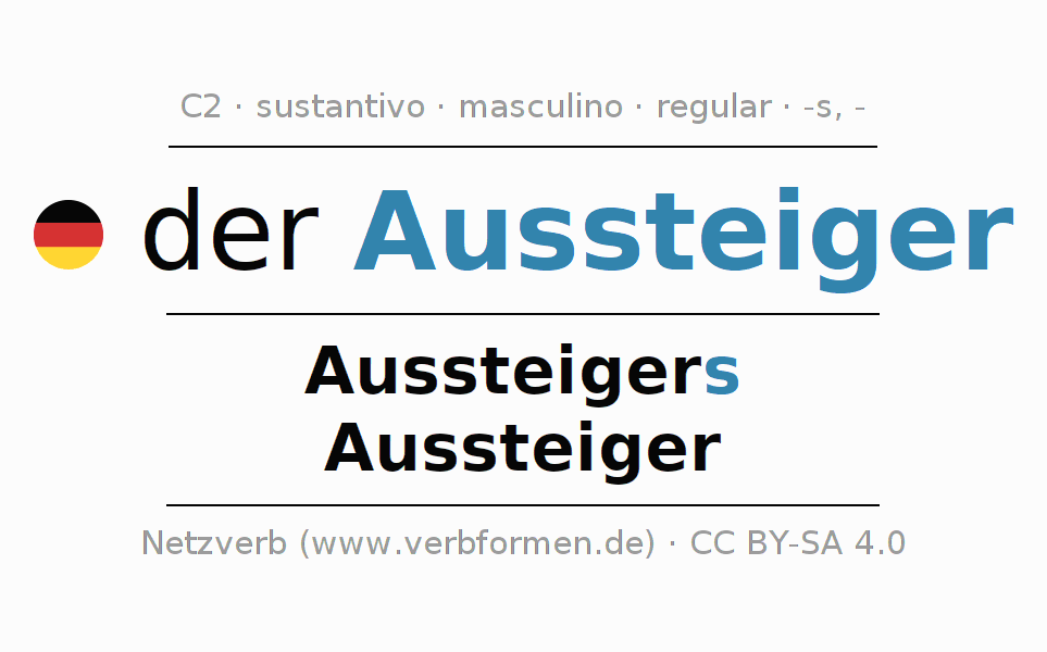 La declinación del sustantivoAussteiger (desertor, salir) se encuentra en genitivoAussteigers del singular y en el nominativoAussteiger del plural. El sustantivo Aussteiger se conjuga de forma fuerte (irregular) con estas terminaciones s/-. El género gramatical de Aussteiger es masculino y por eso se requiere el artículo definido ‘der’. Aquí puedes declinar no solamente Aussteiger sino también todos los sustantivos alemanes . Este sustantivo pertenece al vocabulario necesario para pasar el examen "Zertifikat Deutsch" o para el nivel C2. Comentarios ☆
