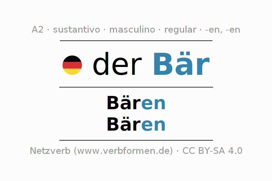 La declinación del sustantivo en forma de tabla con todas su formas: singular, plural y en los cuatro casos: nominativo (primer caso), genitivo (segundo caso), dativo (tercer caso) y acusativo (cuarto caso). Las construcciones gramaticales están representadas de forma clara en una tabla sinópica. La inflexión de los sustantivos es una ayuda durante tareas, exámenes, para cursos de alemán, la universidad, el estudio del alemán como lengua extranjera o como segundo idioma y para estudiantes adultos. La declinación correcta de las palabras es especialmente importante para los que aprenden el idioma alemán. Aquí encontraras más información acerca del tema Wiktionary Bär y aquí también a través del Duden Bär.