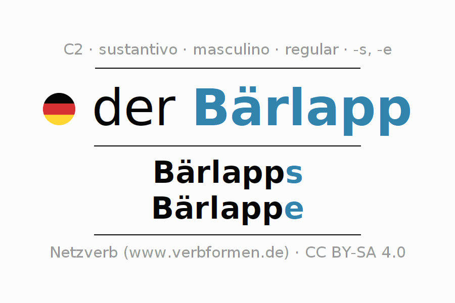 La declinación del sustantivo en forma de tabla con todas su formas: singular, plural y en los cuatro casos: nominativo (primer caso), genitivo (segundo caso), dativo (tercer caso) y acusativo (cuarto caso). Las construcciones gramaticales están representadas de forma clara en una tabla sinópica. La inflexión de los sustantivos es una ayuda durante tareas, exámenes, para cursos de alemán, la universidad, el estudio del alemán como lengua extranjera o como segundo idioma y para estudiantes adultos. La declinación correcta de las palabras es especialmente importante para los que aprenden el idioma alemán. Aquí encontraras más información acerca del tema Wiktionary Bärlapp y aquí también a través del Duden Bärlapp.