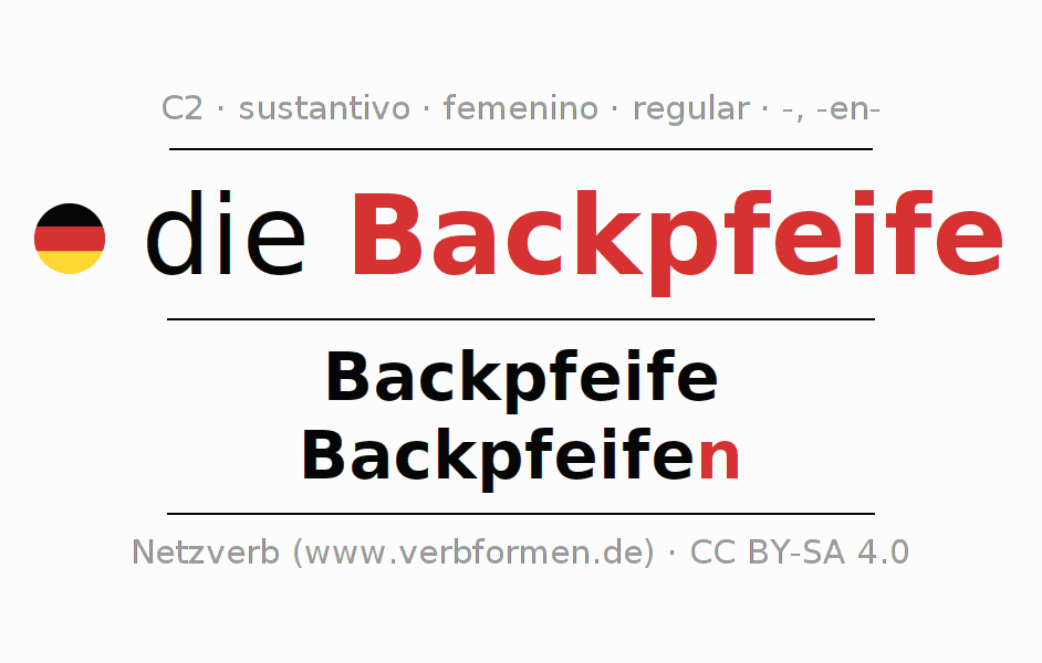 La declinación del sustantivoBackpfeife (bofetada, cobarde) se encuentra en genitivoBackpfeife del singular y en el nominativoBackpfeifen del plural. El sustantivo Backpfeife se declina de forma débil con las terminaciones -/n. El género gramatical de Backpfeife es femenino y por eso se requiere el artículo definido ‘die’. Aquí puedes declinar no solamente Backpfeife sino también todos los sustantivos alemanes . Este sustantivo pertenece al vocabulario necesario para pasar el examen "Zertifikat Deutsch" o para el nivel C2. Comentarios ☆