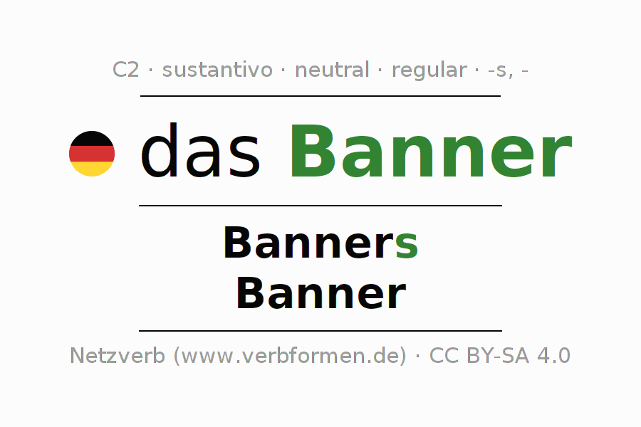 La declinación del sustantivoBanner (estandarte, banner) se encuentra en genitivoBanners del singular y en el nominativoBanner del plural. El sustantivo Banner se conjuga de forma fuerte (irregular) con estas terminaciones s/-. El género gramatical de Banner es neutro y por eso se requiere el artículo definido ‘das’. Pero el sustantivo puede ser utilizado también con otros géneros y otros artículos. Aquí puedes declinar no solamente Banner sino también todos los sustantivos alemanes . Este sustantivo pertenece al vocabulario necesario para pasar el examen "Zertifikat Deutsch" o para el nivel C2. Comentarios ☆