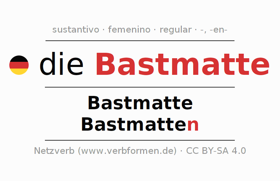 La declinación del sustantivo en forma de tabla con todas su formas: singular, plural y en los cuatro casos: nominativo (primer caso), genitivo (segundo caso), dativo (tercer caso) y acusativo (cuarto caso). Las construcciones gramaticales están representadas de forma clara en una tabla sinópica. La inflexión de los sustantivos es una ayuda durante tareas, exámenes, para cursos de alemán, la universidad, el estudio del alemán como lengua extranjera o como segundo idioma y para estudiantes adultos. La declinación correcta de las palabras es especialmente importante para los que aprenden el idioma alemán. Aquí encontraras más información acerca del tema Wiktionary Bastmatte y aquí también a través del Duden Bastmatte.