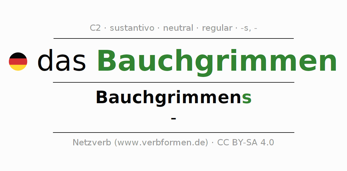 La declinación del sustantivoBauchgrimmen (dolor abdominal ligero, dolor de barriga) se encuentra en genitivoBauchgrimmens del singular y en el nominativo- del plural. El sustantivo Bauchgrimmen se conjuga de forma fuerte (irregular) con estas terminaciones s/-. No permite construcciones en plural. El género gramatical de Bauchgrimmen es neutro y por eso se requiere el artículo definido ‘das’. Aquí puedes declinar no solamente Bauchgrimmen sino también todos los sustantivos alemanes . Este sustantivo pertenece al vocabulario necesario para pasar el examen "Zertifikat Deutsch" o para el nivel C2. Comentarios ☆