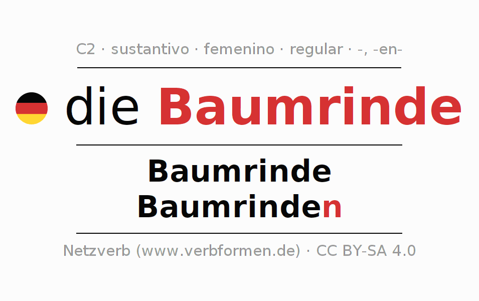 La declinación del sustantivo en forma de tabla con todas su formas: singular, plural y en los cuatro casos: nominativo (primer caso), genitivo (segundo caso), dativo (tercer caso) y acusativo (cuarto caso). Las construcciones gramaticales están representadas de forma clara en una tabla sinópica. La inflexión de los sustantivos es una ayuda durante tareas, exámenes, para cursos de alemán, la universidad, el estudio del alemán como lengua extranjera o como segundo idioma y para estudiantes adultos. La declinación correcta de las palabras es especialmente importante para los que aprenden el idioma alemán. Aquí encontraras más información acerca del tema Wiktionary Baumrinde y aquí también a través del Duden Baumrinde.