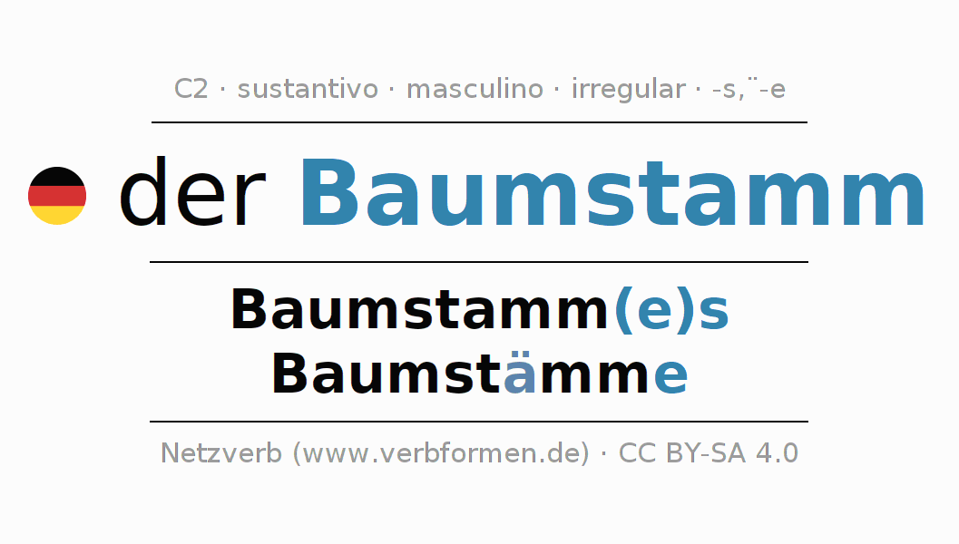 La declinación del sustantivo en forma de tabla con todas su formas: singular, plural y en los cuatro casos: nominativo (primer caso), genitivo (segundo caso), dativo (tercer caso) y acusativo (cuarto caso). Las construcciones gramaticales están representadas de forma clara en una tabla sinópica. La inflexión de los sustantivos es una ayuda durante tareas, exámenes, para cursos de alemán, la universidad, el estudio del alemán como lengua extranjera o como segundo idioma y para estudiantes adultos. La declinación correcta de las palabras es especialmente importante para los que aprenden el idioma alemán. Aquí encontraras más información acerca del tema Wiktionary Baumstamm y aquí también a través del Duden Baumstamm.