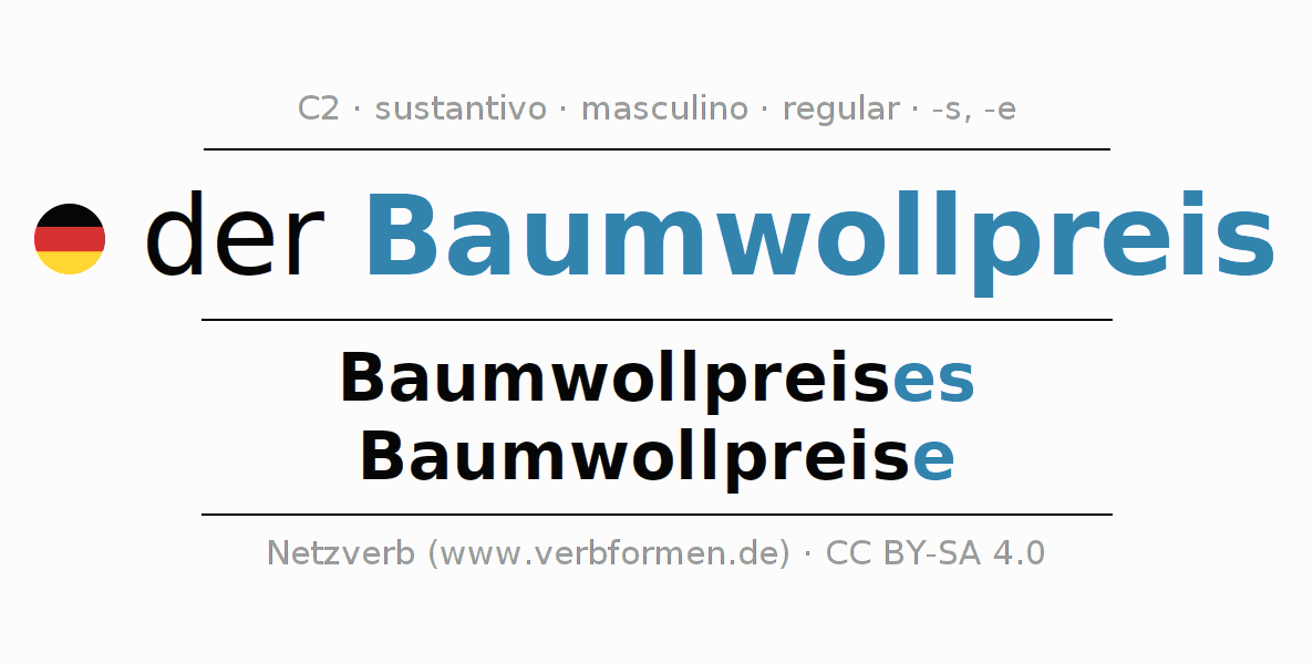 La declinación del sustantivo en forma de tabla con todas su formas: singular, plural y en los cuatro casos: nominativo (primer caso), genitivo (segundo caso), dativo (tercer caso) y acusativo (cuarto caso). Las construcciones gramaticales están representadas de forma clara en una tabla sinópica. La inflexión de los sustantivos es una ayuda durante tareas, exámenes, para cursos de alemán, la universidad, el estudio del alemán como lengua extranjera o como segundo idioma y para estudiantes adultos. La declinación correcta de las palabras es especialmente importante para los que aprenden el idioma alemán. Aquí encontraras más información acerca del tema Wiktionary Baumwollpreis y aquí también a través del Duden Baumwollpreis.