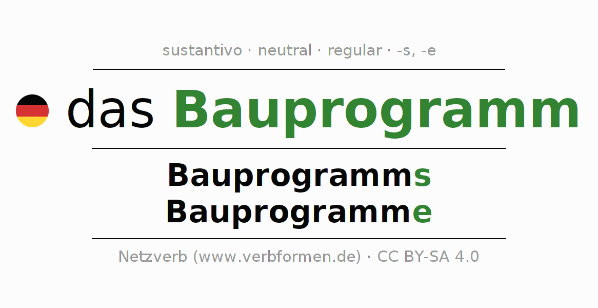 La declinación del sustantivoBauprogramm (programa de construcción) se encuentra en genitivoBauprogramms del singular y en el nominativoBauprogramme del plural. El sustantivo Bauprogramm se conjuga de forma fuerte (irregular) con estas terminaciones s/e. El género gramatical de Bauprogramm es neutro y por eso se requiere el artículo definido ‘das’. Aquí puedes declinar no solamente Bauprogramm sino también todos los sustantivos alemanes . Comentarios ☆