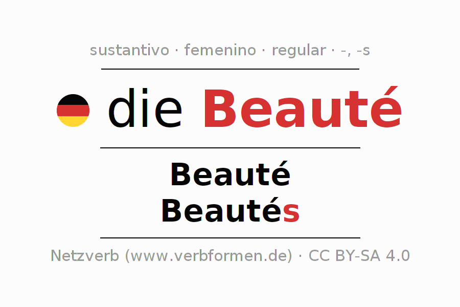 La declinación del sustantivo en forma de tabla con todas su formas: singular, plural y en los cuatro casos: nominativo (primer caso), genitivo (segundo caso), dativo (tercer caso) y acusativo (cuarto caso). Las construcciones gramaticales están representadas de forma clara en una tabla sinópica. La inflexión de los sustantivos es una ayuda durante tareas, exámenes, para cursos de alemán, la universidad, el estudio del alemán como lengua extranjera o como segundo idioma y para estudiantes adultos. La declinación correcta de las palabras es especialmente importante para los que aprenden el idioma alemán. Aquí encontraras más información acerca del tema Wiktionary Beauté y aquí también a través del Duden Beauté.