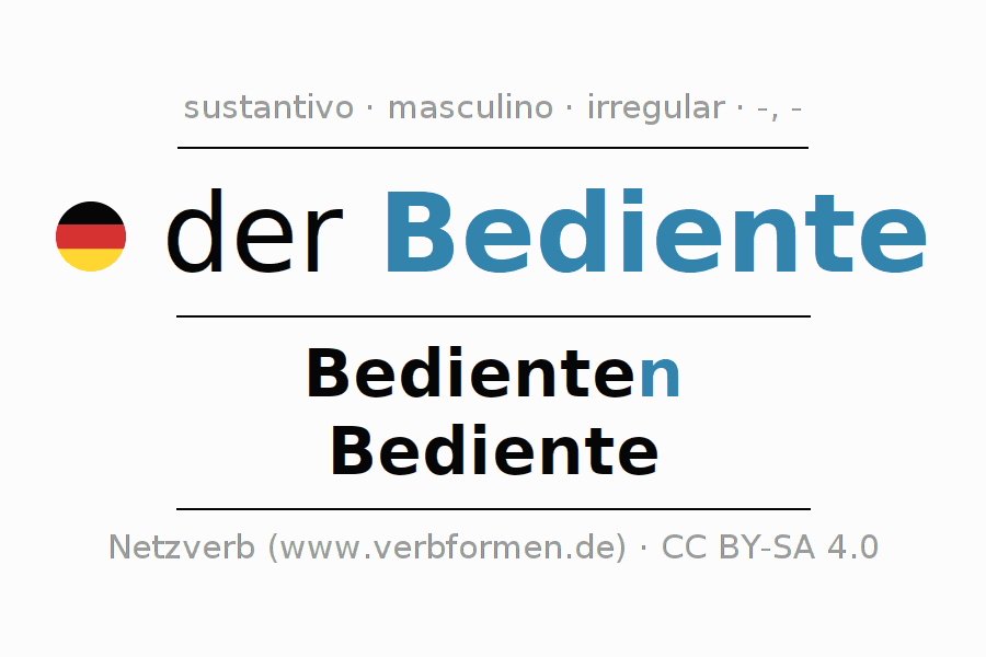 La declinación del sustantivo en forma de tabla con todas su formas: singular, plural y en los cuatro casos: nominativo (primer caso), genitivo (segundo caso), dativo (tercer caso) y acusativo (cuarto caso). Las construcciones gramaticales están representadas de forma clara en una tabla sinópica. La inflexión de los sustantivos es una ayuda durante tareas, exámenes, para cursos de alemán, la universidad, el estudio del alemán como lengua extranjera o como segundo idioma y para estudiantes adultos. La declinación correcta de las palabras es especialmente importante para los que aprenden el idioma alemán. Aquí encontraras más información acerca del tema Wiktionary Bediente y aquí también a través del Duden Bediente.