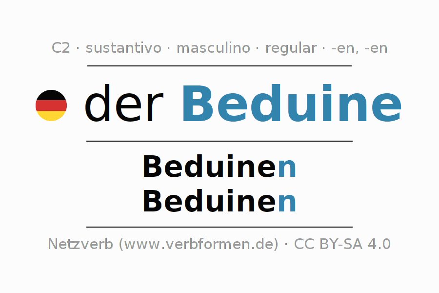 La declinación del sustantivo en forma de tabla con todas su formas: singular, plural y en los cuatro casos: nominativo (primer caso), genitivo (segundo caso), dativo (tercer caso) y acusativo (cuarto caso). Las construcciones gramaticales están representadas de forma clara en una tabla sinópica. La inflexión de los sustantivos es una ayuda durante tareas, exámenes, para cursos de alemán, la universidad, el estudio del alemán como lengua extranjera o como segundo idioma y para estudiantes adultos. La declinación correcta de las palabras es especialmente importante para los que aprenden el idioma alemán. Aquí encontraras más información acerca del tema Wiktionary Beduine y aquí también a través del Duden Beduine.