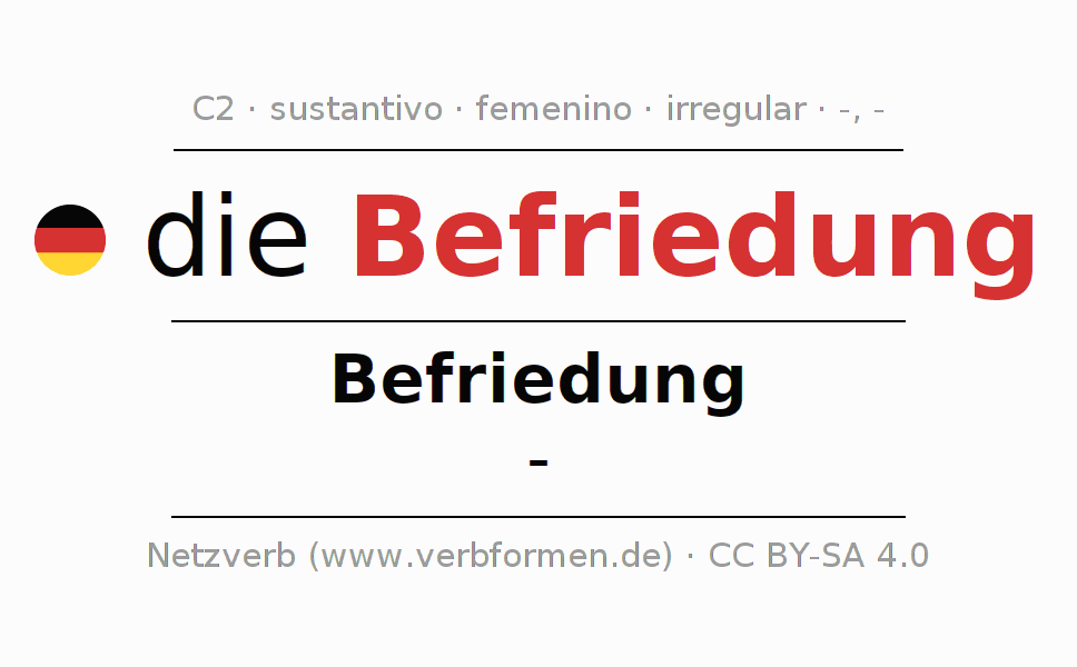 La declinación del sustantivoBefriedung (pacificación, resolución) se encuentra en genitivoBefriedung del singular y en el nominativo- del plural. El sustantivo Befriedung se declina con las terminaciones -/-. No permite construcciones en plural. El género gramatical de Befriedung es femenino y por eso se requiere el artículo definido ‘die’. Aquí puedes declinar no solamente Befriedung sino también todos los sustantivos alemanes . Este sustantivo pertenece al vocabulario necesario para pasar el examen "Zertifikat Deutsch" o para el nivel C2. Comentarios ☆