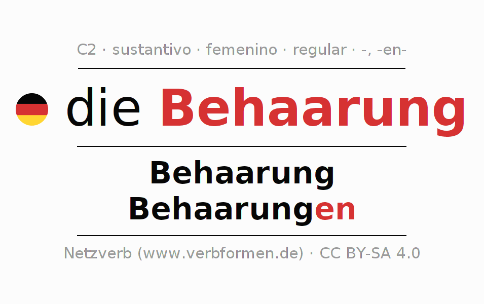La declinación del sustantivo en forma de tabla con todas su formas: singular, plural y en los cuatro casos: nominativo (primer caso), genitivo (segundo caso), dativo (tercer caso) y acusativo (cuarto caso). Las construcciones gramaticales están representadas de forma clara en una tabla sinópica. La inflexión de los sustantivos es una ayuda durante tareas, exámenes, para cursos de alemán, la universidad, el estudio del alemán como lengua extranjera o como segundo idioma y para estudiantes adultos. La declinación correcta de las palabras es especialmente importante para los que aprenden el idioma alemán. Aquí encontraras más información acerca del tema Wiktionary Behaarung y aquí también a través del Duden Behaarung.
