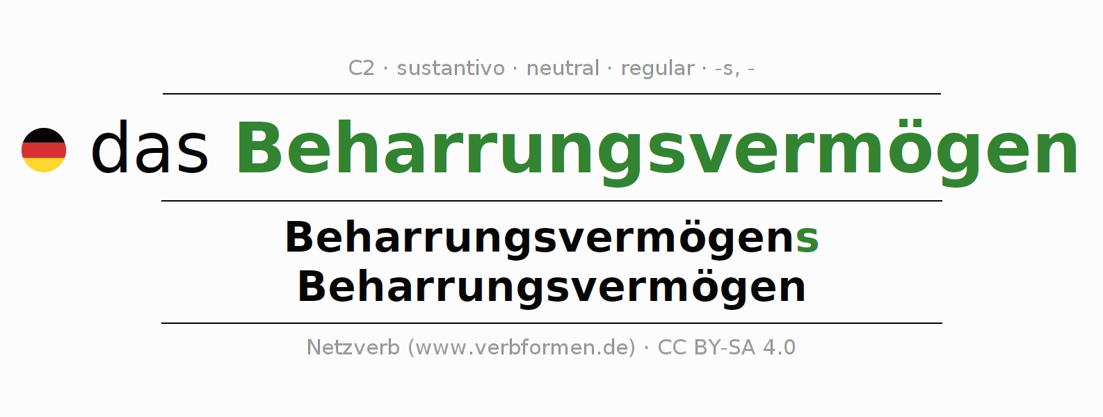 La declinación del sustantivo en forma de tabla con todas su formas: singular, plural y en los cuatro casos: nominativo (primer caso), genitivo (segundo caso), dativo (tercer caso) y acusativo (cuarto caso). Las construcciones gramaticales están representadas de forma clara en una tabla sinópica. La inflexión de los sustantivos es una ayuda durante tareas, exámenes, para cursos de alemán, la universidad, el estudio del alemán como lengua extranjera o como segundo idioma y para estudiantes adultos. La declinación correcta de las palabras es especialmente importante para los que aprenden el idioma alemán. Aquí encontraras más información acerca del tema Wiktionary Beharrungsvermögen y aquí también a través del Duden Beharrungsvermögen.