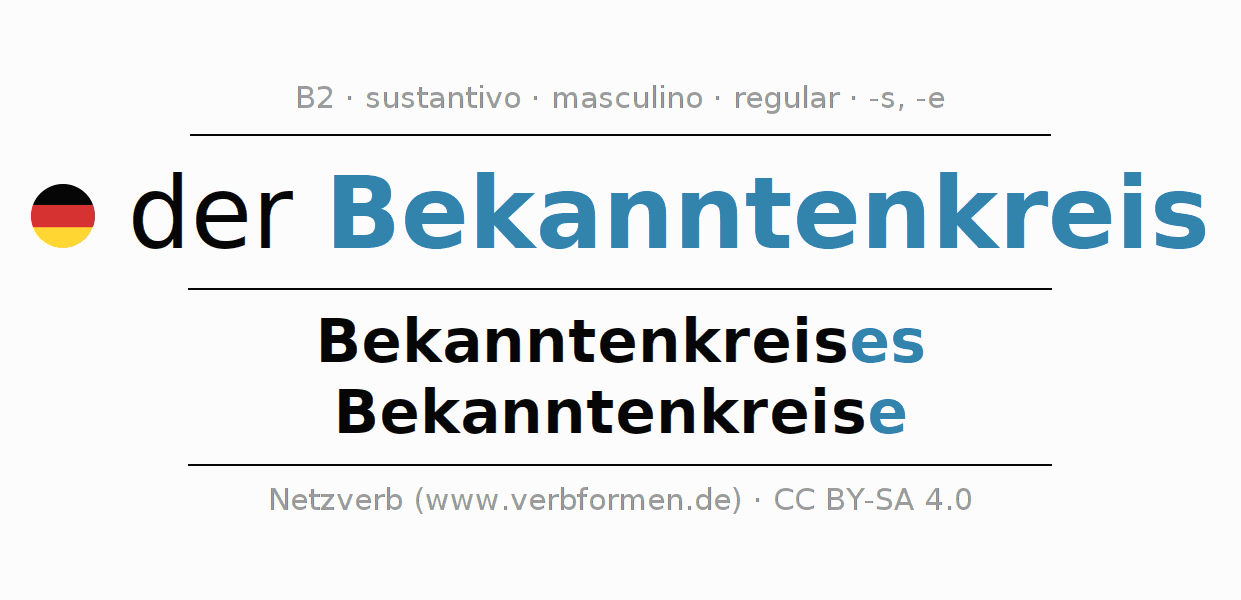La declinación del sustantivo en forma de tabla con todas su formas: singular, plural y en los cuatro casos: nominativo (primer caso), genitivo (segundo caso), dativo (tercer caso) y acusativo (cuarto caso). Las construcciones gramaticales están representadas de forma clara en una tabla sinópica. La inflexión de los sustantivos es una ayuda durante tareas, exámenes, para cursos de alemán, la universidad, el estudio del alemán como lengua extranjera o como segundo idioma y para estudiantes adultos. La declinación correcta de las palabras es especialmente importante para los que aprenden el idioma alemán. Aquí encontraras más información acerca del tema Wiktionary Bekanntenkreis y aquí también a través del Duden Bekanntenkreis.