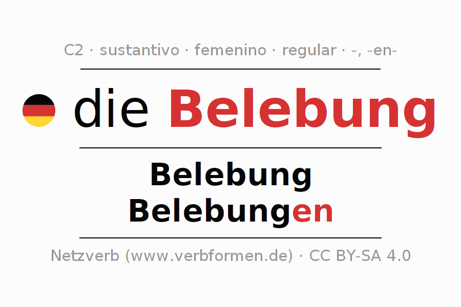 La declinación del sustantivo en forma de tabla con todas su formas: singular, plural y en los cuatro casos: nominativo (primer caso), genitivo (segundo caso), dativo (tercer caso) y acusativo (cuarto caso). Las construcciones gramaticales están representadas de forma clara en una tabla sinópica. La inflexión de los sustantivos es una ayuda durante tareas, exámenes, para cursos de alemán, la universidad, el estudio del alemán como lengua extranjera o como segundo idioma y para estudiantes adultos. La declinación correcta de las palabras es especialmente importante para los que aprenden el idioma alemán. Aquí encontraras más información acerca del tema Wiktionary Belebung y aquí también a través del Duden Belebung.
