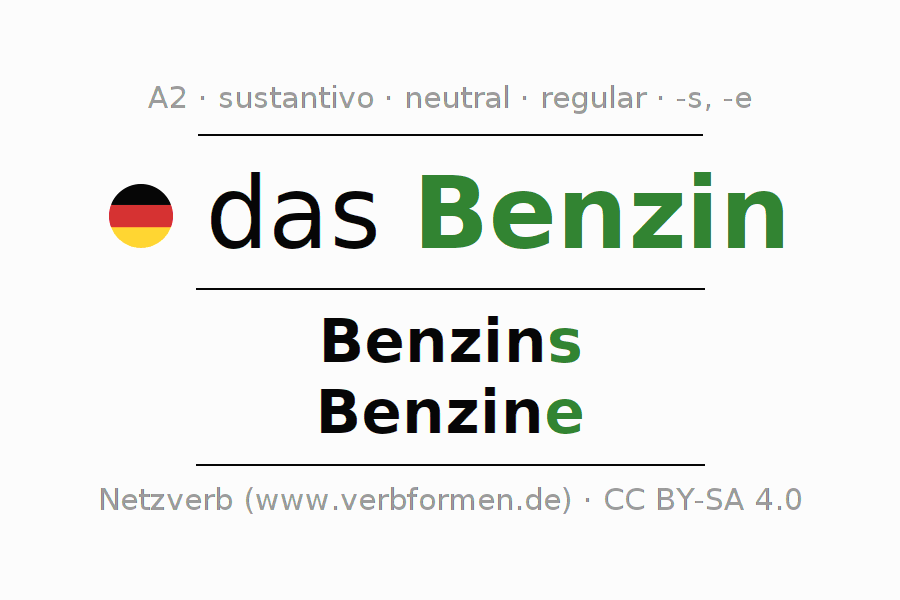 La declinación del sustantivoBenzin (gasolina, bencina) se encuentra en genitivoBenzins del singular y en el nominativoBenzine del plural. El sustantivo Benzin se conjuga de forma fuerte (irregular) con estas terminaciones s/e. El género gramatical de Benzin es neutro y por eso se requiere el artículo definido ‘das’. Aquí puedes declinar no solamente Benzin sino también todos los sustantivos alemanes . Este sustantivo pertenece al vocabulario necesario para pasar el examen "Zertifikat Deutsch" o para el nivel A2. Comentarios ☆