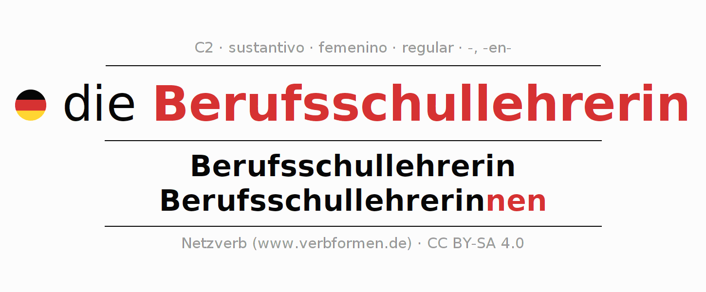 La declinación del sustantivo en forma de tabla con todas su formas: singular, plural y en los cuatro casos: nominativo (primer caso), genitivo (segundo caso), dativo (tercer caso) y acusativo (cuarto caso). Las construcciones gramaticales están representadas de forma clara en una tabla sinópica. La inflexión de los sustantivos es una ayuda durante tareas, exámenes, para cursos de alemán, la universidad, el estudio del alemán como lengua extranjera o como segundo idioma y para estudiantes adultos. La declinación correcta de las palabras es especialmente importante para los que aprenden el idioma alemán. Aquí encontraras más información acerca del tema Wiktionary Berufsschullehrerin y aquí también a través del Duden Berufsschullehrerin.