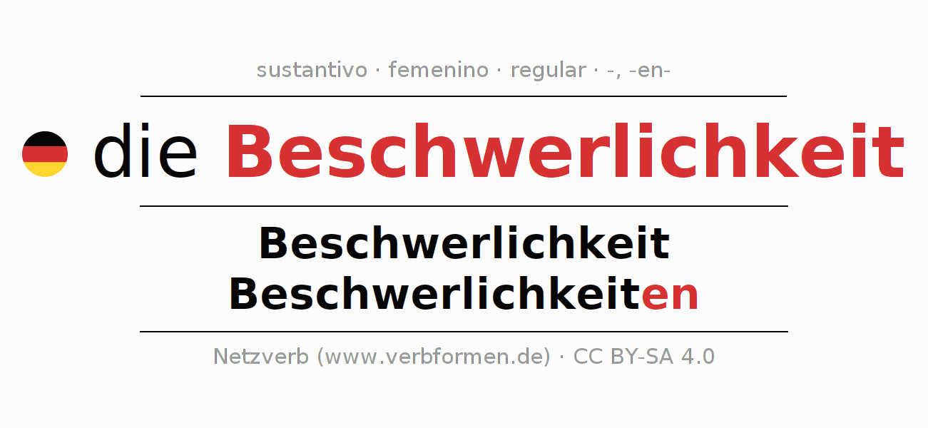 La declinación del sustantivoBeschwerlichkeit (dificultad, esfuerzo) se encuentra en genitivoBeschwerlichkeit del singular y en el nominativoBeschwerlichkeiten del plural. El sustantivo Beschwerlichkeit se declina de forma débil con las terminaciones -/en. El género gramatical de Beschwerlichkeit es femenino y por eso se requiere el artículo definido ‘die’. Aquí puedes declinar no solamente Beschwerlichkeit sino también todos los sustantivos alemanes . Comentarios ☆