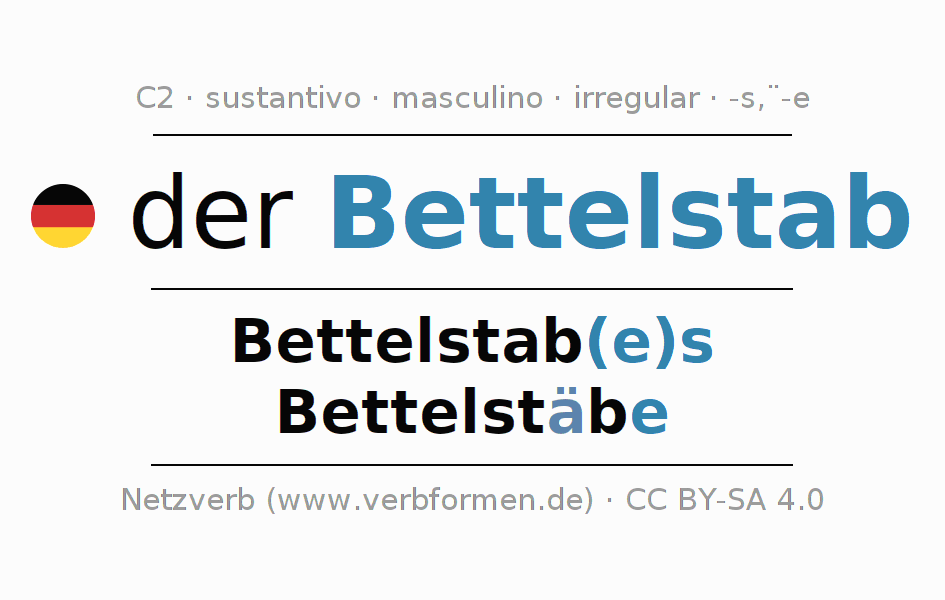 La declinación del sustantivo en forma de tabla con todas su formas: singular, plural y en los cuatro casos: nominativo (primer caso), genitivo (segundo caso), dativo (tercer caso) y acusativo (cuarto caso). Las construcciones gramaticales están representadas de forma clara en una tabla sinópica. La inflexión de los sustantivos es una ayuda durante tareas, exámenes, para cursos de alemán, la universidad, el estudio del alemán como lengua extranjera o como segundo idioma y para estudiantes adultos. La declinación correcta de las palabras es especialmente importante para los que aprenden el idioma alemán. Aquí encontraras más información acerca del tema Wiktionary Bettelstab y aquí también a través del Duden Bettelstab.