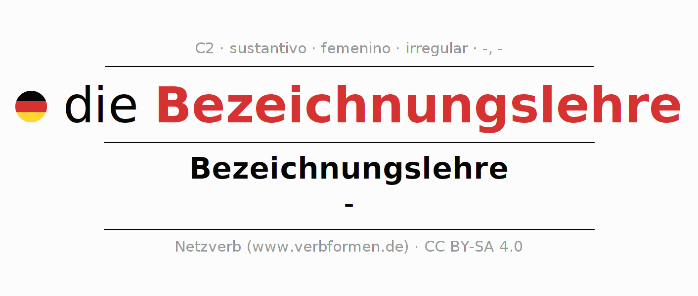 La declinación del sustantivoBezeichnungslehre (onomasiología, nomenclatura) se encuentra en genitivoBezeichnungslehre del singular y en el nominativo- del plural. El sustantivo Bezeichnungslehre se declina con las terminaciones -/-. No permite construcciones en plural. El género gramatical de Bezeichnungslehre es femenino y por eso se requiere el artículo definido ‘die’. Aquí puedes declinar no solamente Bezeichnungslehre sino también todos los sustantivos alemanes . Este sustantivo pertenece al vocabulario necesario para pasar el examen "Zertifikat Deutsch" o para el nivel C2. Comentarios ☆
