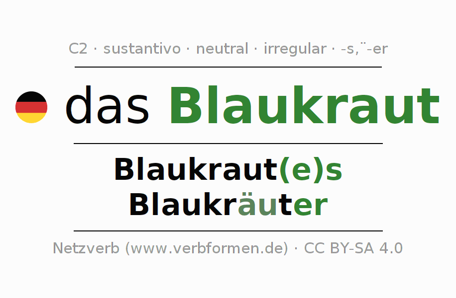 La declinación del sustantivo en forma de tabla con todas su formas: singular, plural y en los cuatro casos: nominativo (primer caso), genitivo (segundo caso), dativo (tercer caso) y acusativo (cuarto caso). Las construcciones gramaticales están representadas de forma clara en una tabla sinópica. La inflexión de los sustantivos es una ayuda durante tareas, exámenes, para cursos de alemán, la universidad, el estudio del alemán como lengua extranjera o como segundo idioma y para estudiantes adultos. La declinación correcta de las palabras es especialmente importante para los que aprenden el idioma alemán. Aquí encontraras más información acerca del tema Wiktionary Blaukraut y aquí también a través del Duden Blaukraut.