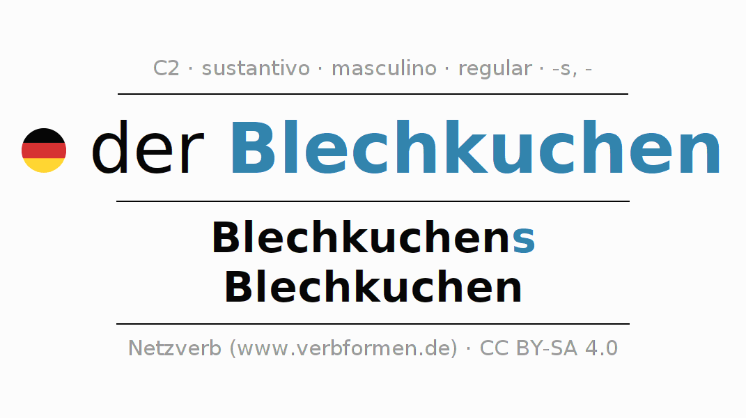 La declinación del sustantivo en forma de tabla con todas su formas: singular, plural y en los cuatro casos: nominativo (primer caso), genitivo (segundo caso), dativo (tercer caso) y acusativo (cuarto caso). Las construcciones gramaticales están representadas de forma clara en una tabla sinópica. La inflexión de los sustantivos es una ayuda durante tareas, exámenes, para cursos de alemán, la universidad, el estudio del alemán como lengua extranjera o como segundo idioma y para estudiantes adultos. La declinación correcta de las palabras es especialmente importante para los que aprenden el idioma alemán. Aquí encontraras más información acerca del tema Wiktionary Blechkuchen y aquí también a través del Duden Blechkuchen.
