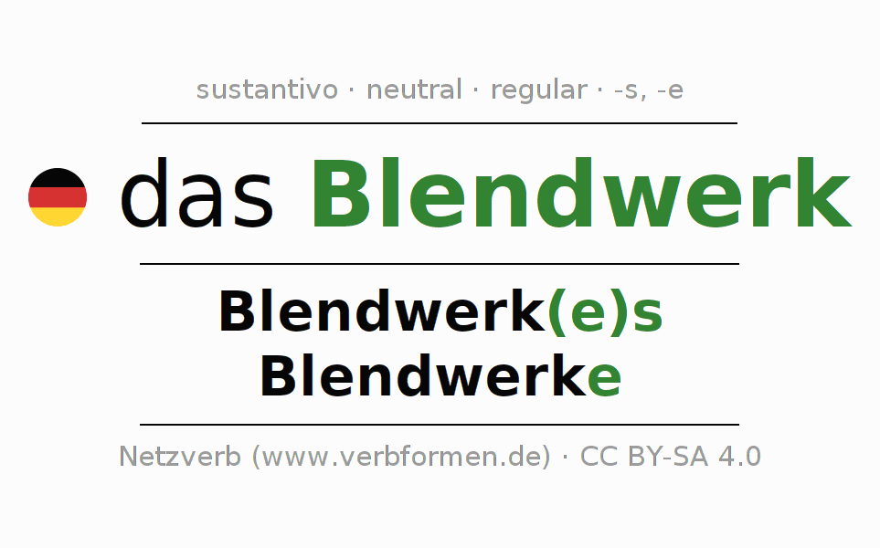 La declinación del sustantivoBlendwerk (ilusión, artificio) se encuentra en genitivoBlendwerk(e)s del singular y en el nominativoBlendwerke del plural. El sustantivo Blendwerk se conjuga de forma fuerte (irregular) con estas terminaciones es/e. El género gramatical de Blendwerk es neutro y por eso se requiere el artículo definido ‘das’. Aquí puedes declinar no solamente Blendwerk sino también todos los sustantivos alemanes . Comentarios ☆