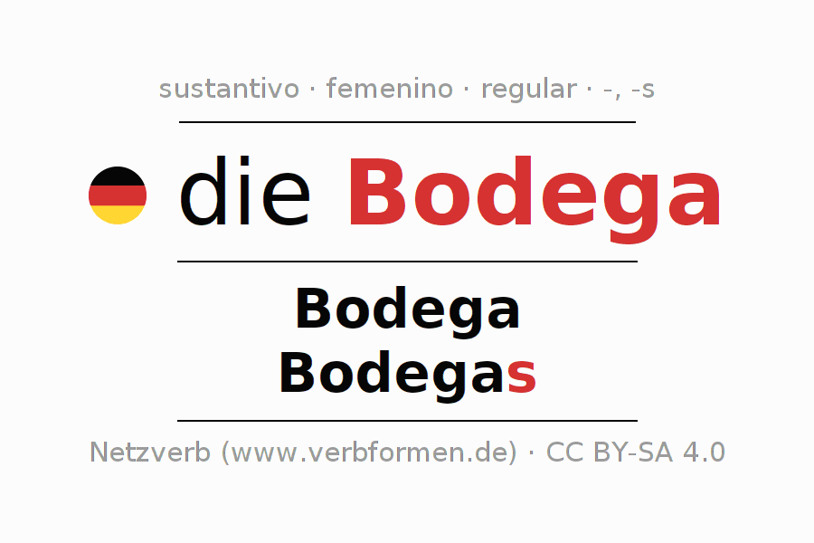 - Plural: die Bodegas, der Bodegas, den Bodegas, die Bodegas