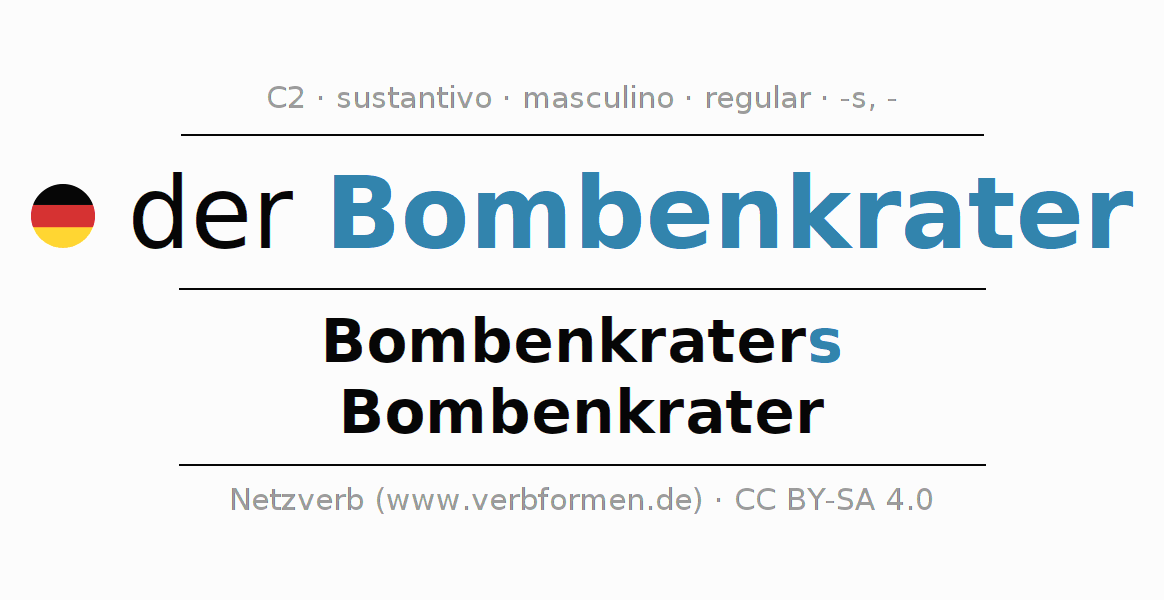 La declinación del sustantivo en forma de tabla con todas su formas: singular, plural y en los cuatro casos: nominativo (primer caso), genitivo (segundo caso), dativo (tercer caso) y acusativo (cuarto caso). Las construcciones gramaticales están representadas de forma clara en una tabla sinópica. La inflexión de los sustantivos es una ayuda durante tareas, exámenes, para cursos de alemán, la universidad, el estudio del alemán como lengua extranjera o como segundo idioma y para estudiantes adultos. La declinación correcta de las palabras es especialmente importante para los que aprenden el idioma alemán. Aquí encontraras más información acerca del tema Wiktionary Bombenkrater y aquí también a través del Duden Bombenkrater.
