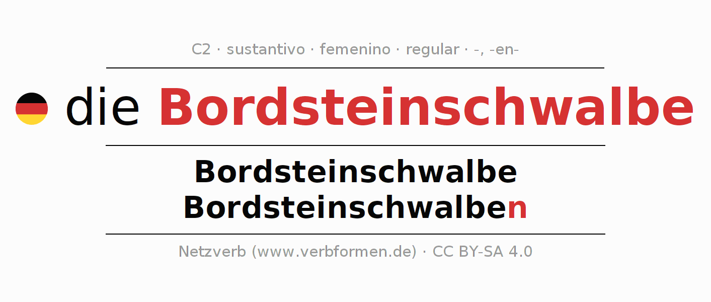La declinación del sustantivo en forma de tabla con todas su formas: singular, plural y en los cuatro casos: nominativo (primer caso), genitivo (segundo caso), dativo (tercer caso) y acusativo (cuarto caso). Las construcciones gramaticales están representadas de forma clara en una tabla sinópica. La inflexión de los sustantivos es una ayuda durante tareas, exámenes, para cursos de alemán, la universidad, el estudio del alemán como lengua extranjera o como segundo idioma y para estudiantes adultos. La declinación correcta de las palabras es especialmente importante para los que aprenden el idioma alemán. Aquí encontraras más información acerca del tema Wiktionary Bordsteinschwalbe y aquí también a través del Duden Bordsteinschwalbe.
