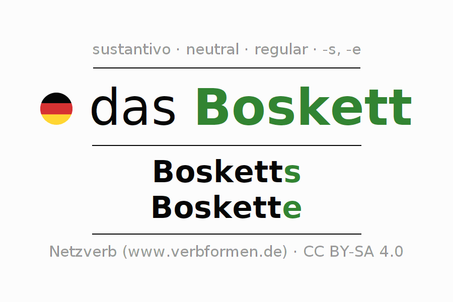 La declinación del sustantivoBoskett (bosquete, arbusto) se encuentra en genitivoBosketts del singular y en el nominativoBoskette del plural. El sustantivo Boskett se conjuga de forma fuerte (irregular) con estas terminaciones s/e. El género gramatical de Boskett es neutro y por eso se requiere el artículo definido ‘das’. Aquí puedes declinar no solamente Boskett sino también todos los sustantivos alemanes . Comentarios ☆