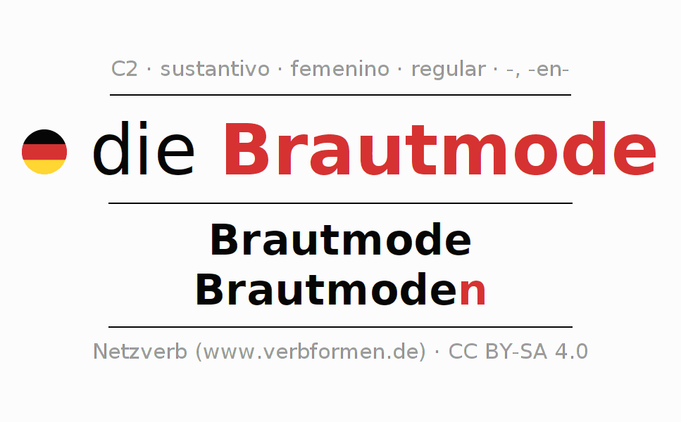 La declinación del sustantivo en forma de tabla con todas su formas: singular, plural y en los cuatro casos: nominativo (primer caso), genitivo (segundo caso), dativo (tercer caso) y acusativo (cuarto caso). Las construcciones gramaticales están representadas de forma clara en una tabla sinópica. La inflexión de los sustantivos es una ayuda durante tareas, exámenes, para cursos de alemán, la universidad, el estudio del alemán como lengua extranjera o como segundo idioma y para estudiantes adultos. La declinación correcta de las palabras es especialmente importante para los que aprenden el idioma alemán. Aquí encontraras más información acerca del tema Wiktionary Brautmode y aquí también a través del Duden Brautmode.