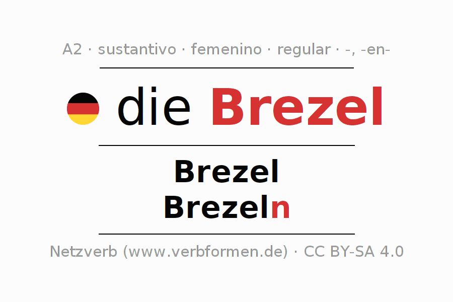 La declinación del sustantivo en forma de tabla con todas su formas: singular, plural y en los cuatro casos: nominativo (primer caso), genitivo (segundo caso), dativo (tercer caso) y acusativo (cuarto caso). Las construcciones gramaticales están representadas de forma clara en una tabla sinópica. La inflexión de los sustantivos es una ayuda durante tareas, exámenes, para cursos de alemán, la universidad, el estudio del alemán como lengua extranjera o como segundo idioma y para estudiantes adultos. La declinación correcta de las palabras es especialmente importante para los que aprenden el idioma alemán. Aquí encontraras más información acerca del tema Wiktionary Brezel y aquí también a través del Duden Brezel.