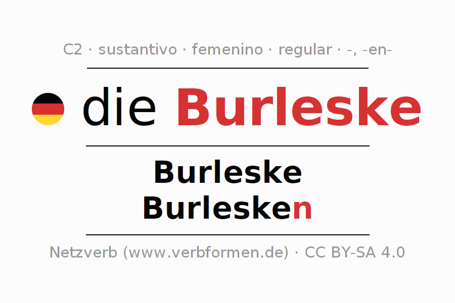 La declinación del sustantivo en forma de tabla con todas su formas: singular, plural y en los cuatro casos: nominativo (primer caso), genitivo (segundo caso), dativo (tercer caso) y acusativo (cuarto caso). Las construcciones gramaticales están representadas de forma clara en una tabla sinópica. La inflexión de los sustantivos es una ayuda durante tareas, exámenes, para cursos de alemán, la universidad, el estudio del alemán como lengua extranjera o como segundo idioma y para estudiantes adultos. La declinación correcta de las palabras es especialmente importante para los que aprenden el idioma alemán. Aquí encontraras más información acerca del tema Wiktionary Burleske y aquí también a través del Duden Burleske.