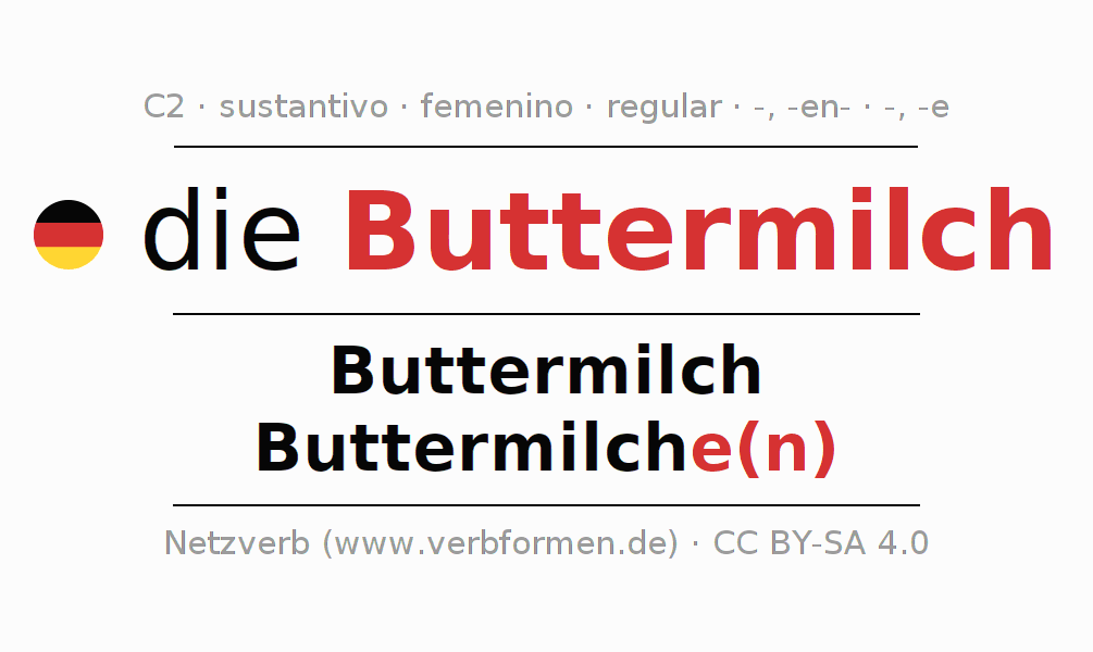 La declinación del sustantivoButtermilch (suero de mantequilla, mazada) se encuentra en genitivoButtermilch del singular y en el nominativoButtermilche(n) del plural. El sustantivo Buttermilch se declina de forma débil con las terminaciones -/en/e. El género gramatical de Buttermilch es femenino y por eso se requiere el artículo definido ‘die’. Aquí puedes declinar no solamente Buttermilch sino también todos los sustantivos alemanes . Este sustantivo pertenece al vocabulario necesario para pasar el examen "Zertifikat Deutsch" o para el nivel C2. Comentarios ☆