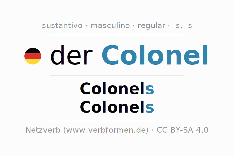 La declinación del sustantivoColonel (coronel) se encuentra en genitivoColonels del singular y en el nominativoColonels del plural. El sustantivo Colonel se conjuga de forma fuerte (irregular) con estas terminaciones s/s. El género gramatical de Colonel es masculino y por eso se requiere el artículo definido ‘der’. Aquí puedes declinar no solamente Colonel sino también todos los sustantivos alemanes . Comentarios ☆