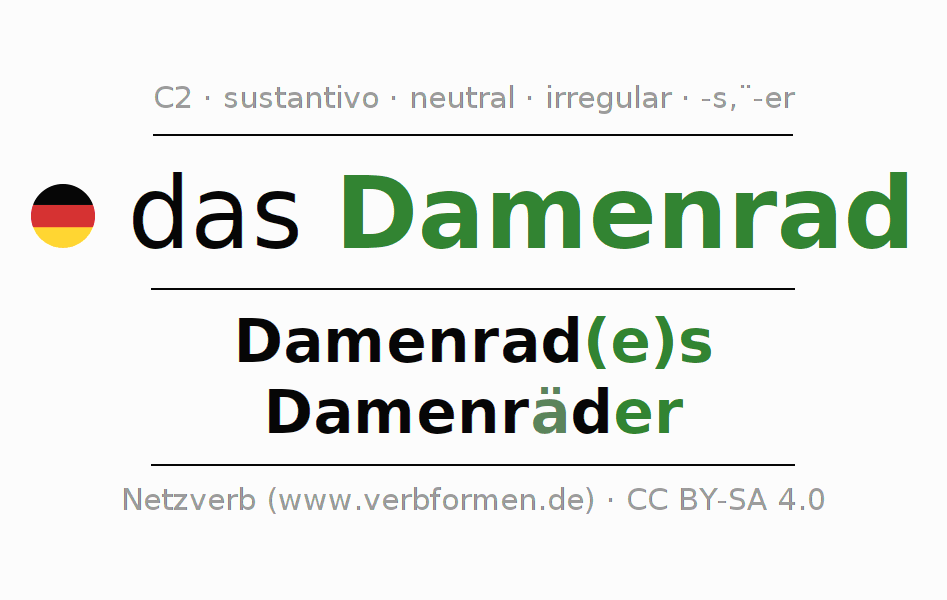 La declinación del sustantivo en forma de tabla con todas su formas: singular, plural y en los cuatro casos: nominativo (primer caso), genitivo (segundo caso), dativo (tercer caso) y acusativo (cuarto caso). Las construcciones gramaticales están representadas de forma clara en una tabla sinópica. La inflexión de los sustantivos es una ayuda durante tareas, exámenes, para cursos de alemán, la universidad, el estudio del alemán como lengua extranjera o como segundo idioma y para estudiantes adultos. La declinación correcta de las palabras es especialmente importante para los que aprenden el idioma alemán. Aquí encontraras más información acerca del tema Wiktionary Damenrad y aquí también a través del Duden Damenrad.