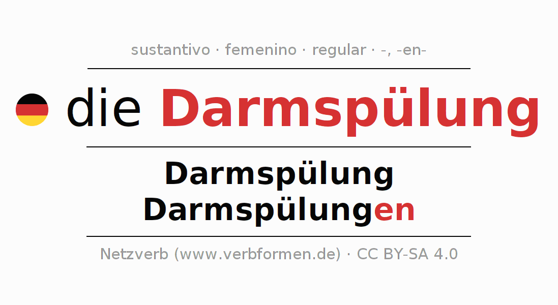 La declinación del sustantivo en forma de tabla con todas su formas: singular, plural y en los cuatro casos: nominativo (primer caso), genitivo (segundo caso), dativo (tercer caso) y acusativo (cuarto caso). Las construcciones gramaticales están representadas de forma clara en una tabla sinópica. La inflexión de los sustantivos es una ayuda durante tareas, exámenes, para cursos de alemán, la universidad, el estudio del alemán como lengua extranjera o como segundo idioma y para estudiantes adultos. La declinación correcta de las palabras es especialmente importante para los que aprenden el idioma alemán. Aquí encontraras más información acerca del tema Wiktionary Darmspülung y aquí también a través del Duden Darmspülung.