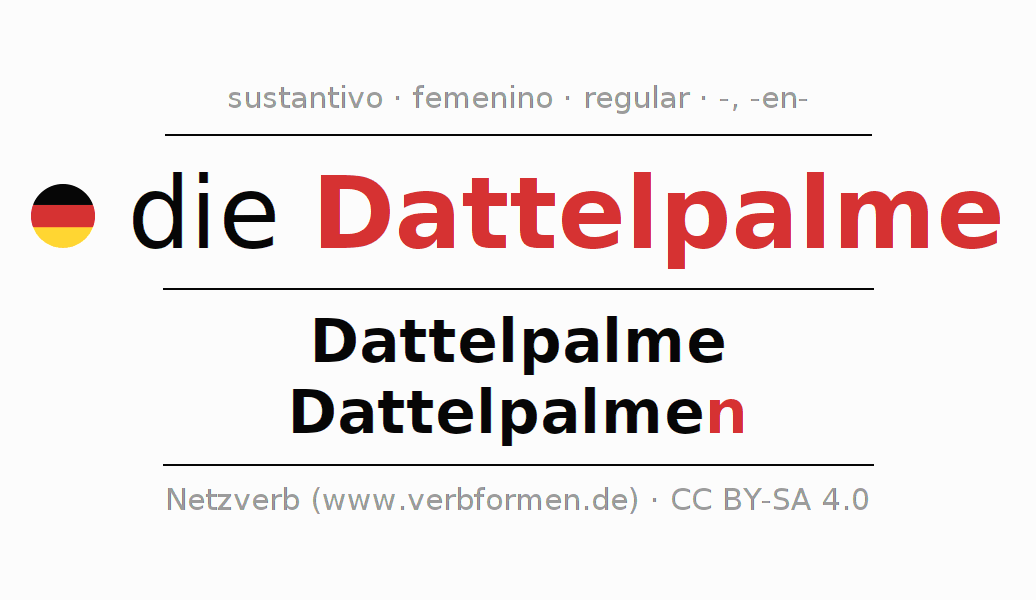 La declinación del sustantivo en forma de tabla con todas su formas: singular, plural y en los cuatro casos: nominativo (primer caso), genitivo (segundo caso), dativo (tercer caso) y acusativo (cuarto caso). Las construcciones gramaticales están representadas de forma clara en una tabla sinópica. La inflexión de los sustantivos es una ayuda durante tareas, exámenes, para cursos de alemán, la universidad, el estudio del alemán como lengua extranjera o como segundo idioma y para estudiantes adultos. La declinación correcta de las palabras es especialmente importante para los que aprenden el idioma alemán. Aquí encontraras más información acerca del tema Wiktionary Dattelpalme y aquí también a través del Duden Dattelpalme.