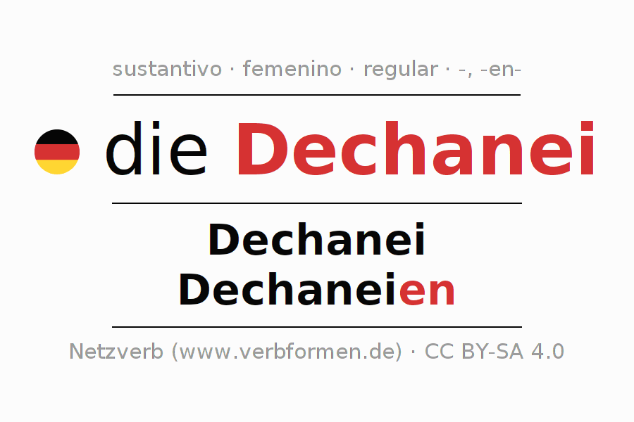 La declinación del sustantivoDechanei se encuentra en genitivoDechanei del singular y en el nominativoDechaneien del plural. El sustantivo Dechanei se declina de forma débil con las terminaciones -/en. El género gramatical de Dechanei es femenino y por eso se requiere el artículo definido ‘die’. Aquí puedes declinar no solamente Dechanei sino también todos los sustantivos alemanes . Comentarios ☆