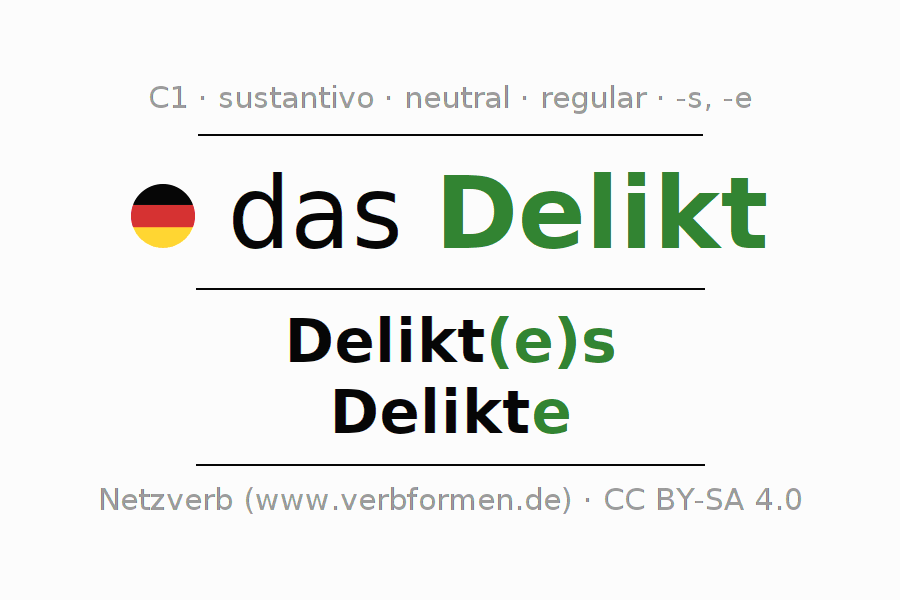 La declinación del sustantivo en forma de tabla con todas su formas: singular, plural y en los cuatro casos: nominativo (primer caso), genitivo (segundo caso), dativo (tercer caso) y acusativo (cuarto caso). Las construcciones gramaticales están representadas de forma clara en una tabla sinópica. La inflexión de los sustantivos es una ayuda durante tareas, exámenes, para cursos de alemán, la universidad, el estudio del alemán como lengua extranjera o como segundo idioma y para estudiantes adultos. La declinación correcta de las palabras es especialmente importante para los que aprenden el idioma alemán. Aquí encontraras más información acerca del tema Wiktionary Delikt y aquí también a través del Duden Delikt.